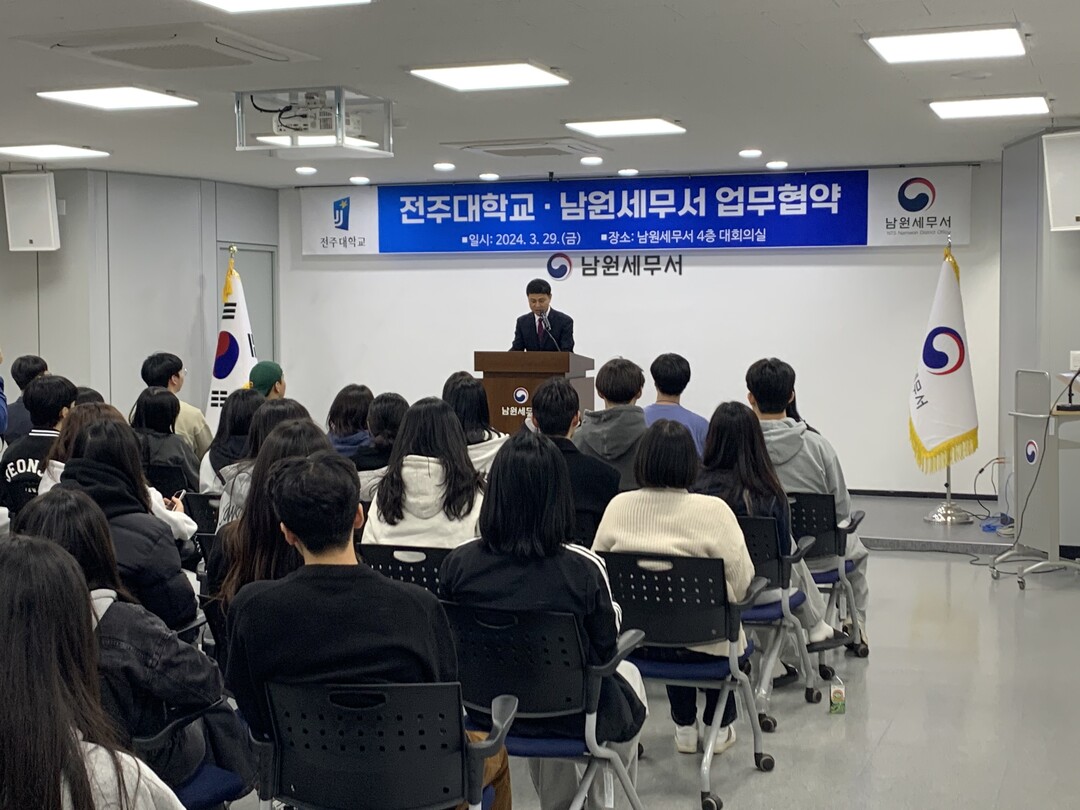 협약식은 남원세무서 4층 대회의실에서 장영수 남원세무서장, 조호형 징세과장, 이성묵 세원관리과장 등 남원세무서 관계자와 전주대 회계세무학과 교수 4명 및 재학생 60여 명이 참석한 가운데 열렸다.