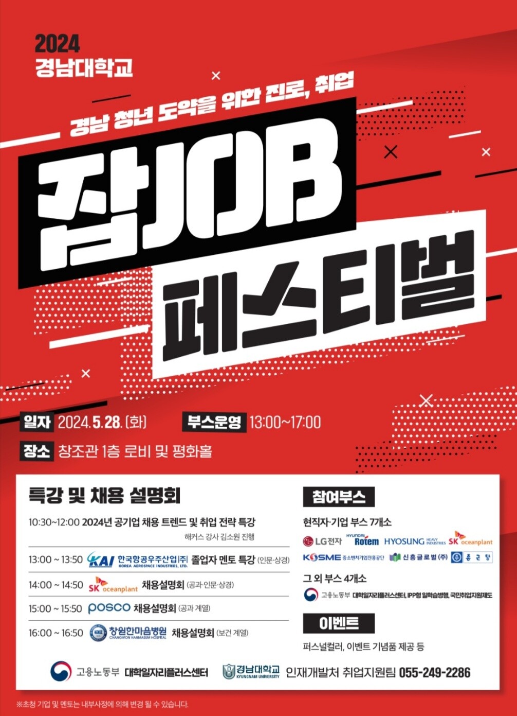 행사는 ‘2024년 공기업 채용 트렌드 및 취업 전략’ 특강을 시작으로 KAI한국항공우주산업 멘토 특강, SK오션플랜트, 포스코, 창원한마음병원 채용 설명회로 이어진다.
