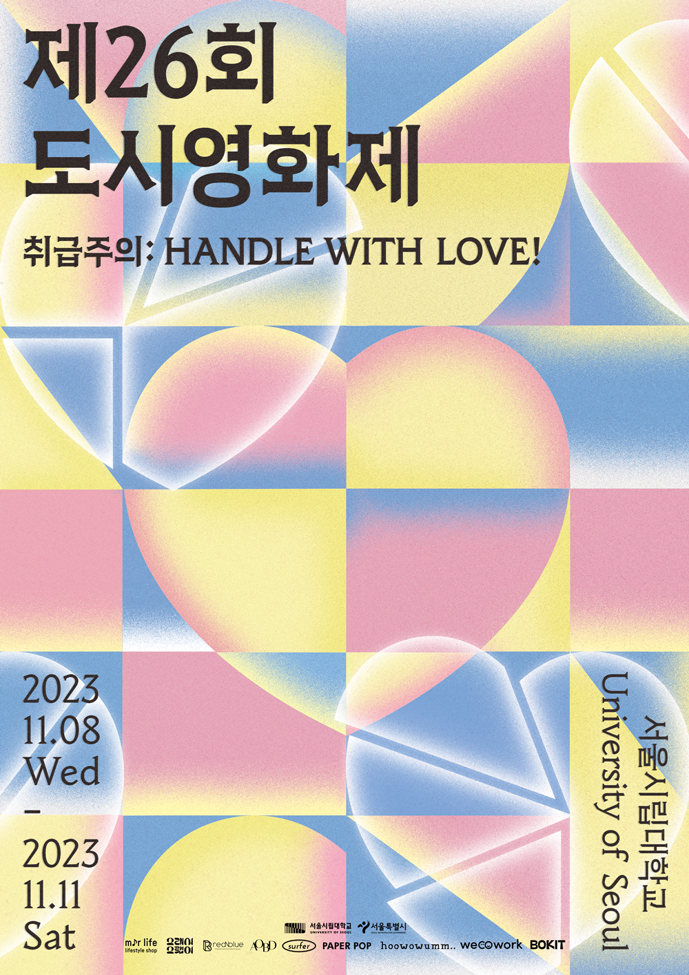 제26회 도시영화제의 슬로건은 ‘취급주의: HANDLE WITH LOVE!’이다. 사랑이라는 이름으로 연결된 관계는 다루기 매우 어렵지만 그럼에도 불구하고 우리는 사랑의 힘이 필요함을 의미한다. 올해 도시영화제의 상영작에서 다양한 형태의 사랑과 사랑의 이면 등을 곳곳에서 확인할 수 있다.