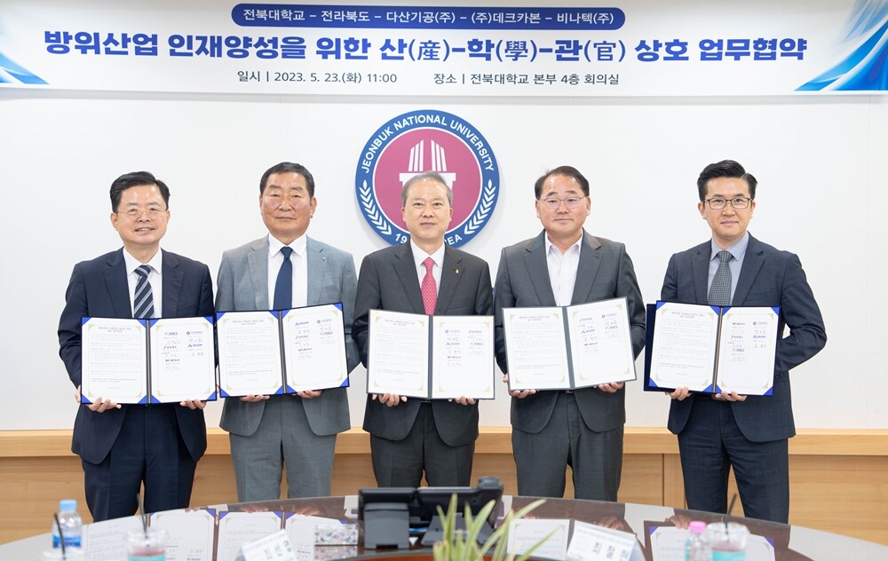 학과 신설을 위해 전북대는 23일 전라북도와 지역 방위산업을 선도하는 다산기공(주), ㈜데크카본, 비나텍(주)과 산‧학‧관 방위산업 전문 인력 양성에 관한 업무협약을 체결했다.