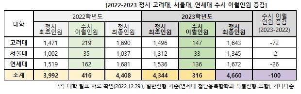 서울대는 수시모집에서 33명이 이월돼 1345명을 정시 지역균형전형 및 일반전형으로 선발한다. 수시 이월인원은 모두 일반전형에서 충원한다. 2022학년도에 비해 정시 선발인원이 크게 증가한 상황에서 수시 이월인원 규모는 전년도(35명)와 유사하다. 이월인원이 발생한 모집단위는 20개로, 조선해양공학과가 5명으로 가장 많고, 간호대학(4명), 화학생물공학부(3명)가 뒤를 이었다. 선호도가 높은 치의학과와 약학계열에서도 1명씩 이월됐다. 이월인원 33명에서 체육교육과 1명을 제외한 32명 중 인문계열 모집단위 이월인원은 4명에 지나지 않아, 수시이월 대부분 자연계열에서 발생했음을 알 수 있다.