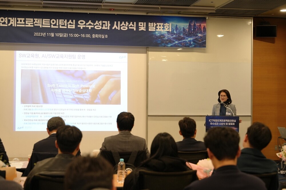 ICT 학점연계 프로젝트 인턴십 우수성과 시상식 및 발표회’에서 중인 정유정 SW교육원 교수. 사진=중앙대 제공 |