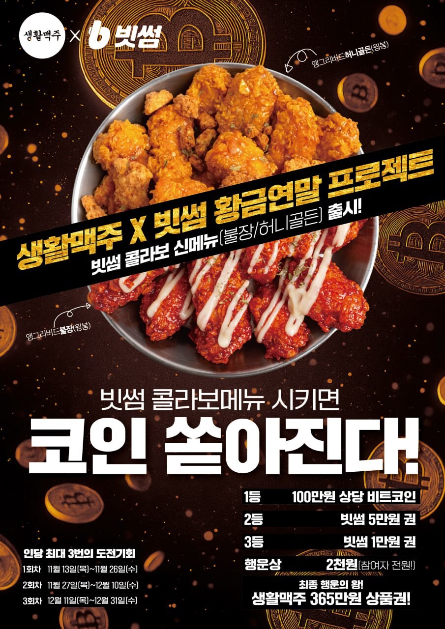 대한민국 대표 맥주 프랜차이즈 생활맥주가 가상자산 거래소 빗썸(Bithumb) 과 함께 연말을 맞아 특별한 콜라보 이벤트를 진행한다. 이번 협업은 일상 속 미식의 즐거움과 디지털 자산 문화를 결합한 이색 프로젝트로, 11월 13일(목)부터 12월 31일(수)까지 전국 생활맥주 매장에서 진행된다.