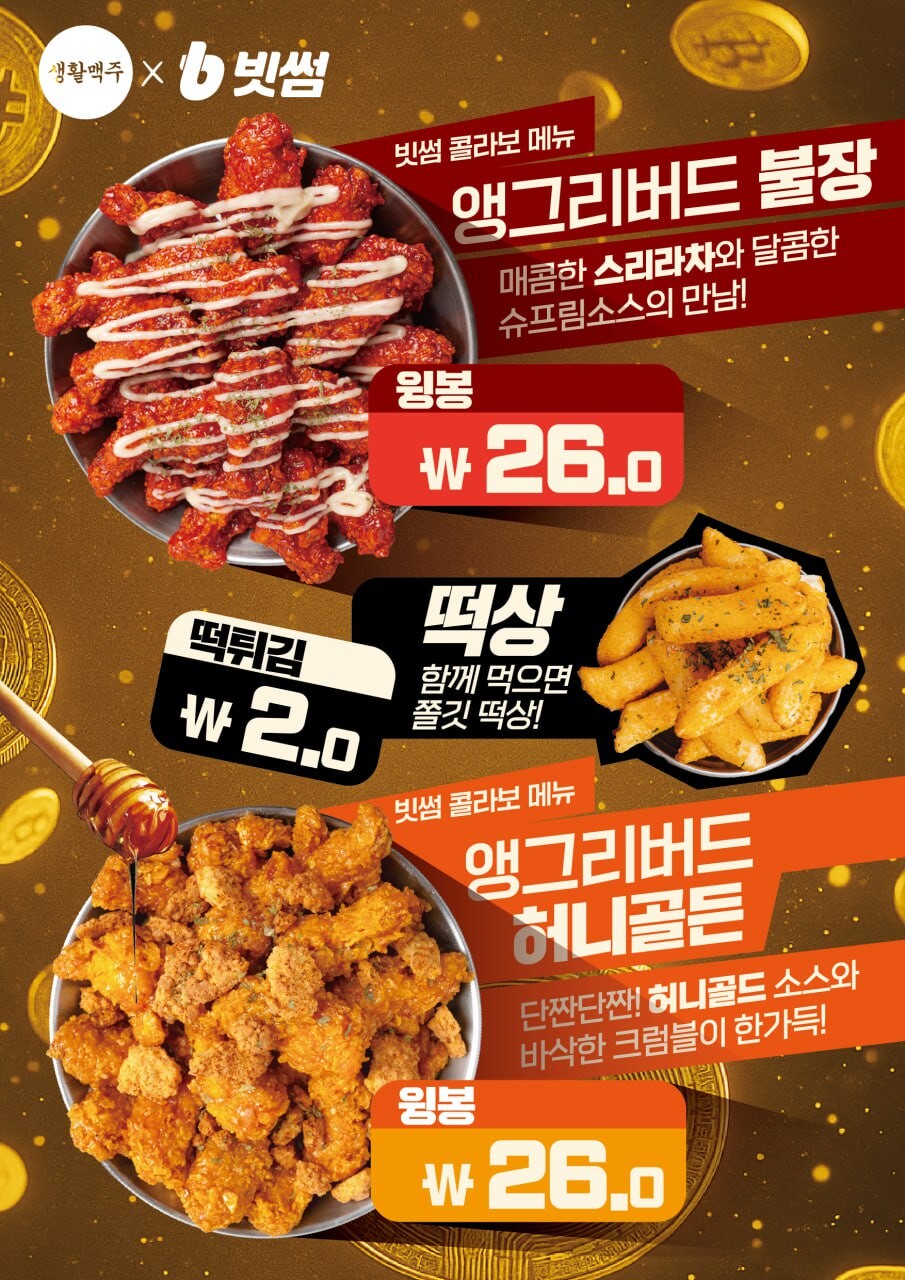 생활맥주는 이번 협업을 기념해 빗썸 콜라보 한정 메뉴 2종도 함께 선보인다. ‘앵그리버드 불장’은 매콤한 스리라차와 달콤한 슈프림소스의 조화로 강렬한 풍미, ‘앵그리버드 허니골든’은 단짠단짠의 허니골드 소스와 바삭한 크럼블을 더해 색다른 맛을 선사한다.