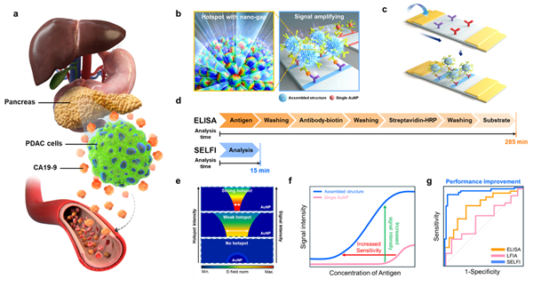 15분 만에 췌장암을 진단하는 SELFI 기술 개념도. (a)췌장암 세포는 혈액 속에 ‘CA19-9’라는 암 표지자를 분비 (b)연구팀은 이 신호를 크게 증폭할 수 있는 특수 나노입자 구조를 개발함 (c)‘SELFI’는 혈액 한 방울을 활용, 시험지에서의 색 변화 결과를 확인하는 방식으로 이루어지는 검사법 (d)기존 검사법은 수 시간이 필요하지만, SELFI는 15분 만에 분석이 가능함 (e)연구팀은 나노입자 구조 최적화를 통해 신호를 더욱 강하게 만듦 (f)그 결과, 기존 신속 진단법보다 훨씬 높은 검출 성능을 보임 (g)정확도 비교에서도 SELFI가 가장 우수한 진단 성능을 나타냄. |