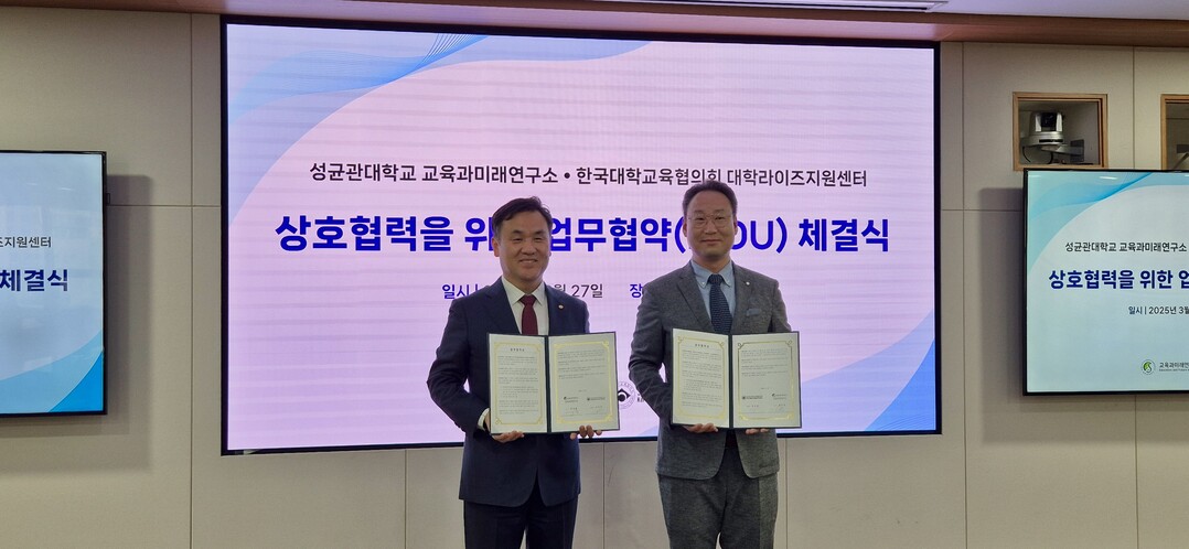 [대학저널 이선용 기자] 한국대학교육협의회(이하 대교협) 대학라이즈지원센터는 성균관대학교 교육과미래연구소와 3월 27일 성균관대 600주년기념관 회의실에서 지역혁신중심 대학지원체계(RISE)의 안정적인 정착을 위한 업무 협약을 체결했다.