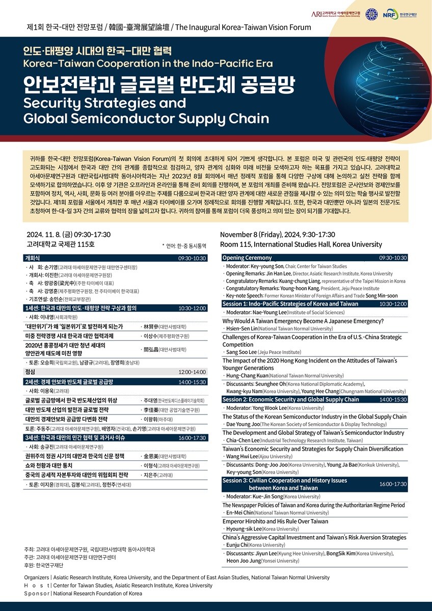 이번 행사는 고려대 아세아문제연구원과 국립대만사범대학 동아시아학과가 공동으로 주최하고, 아세아문제연구원 대만연구센터가 주관하며, 한국연구재단이 후원한다.