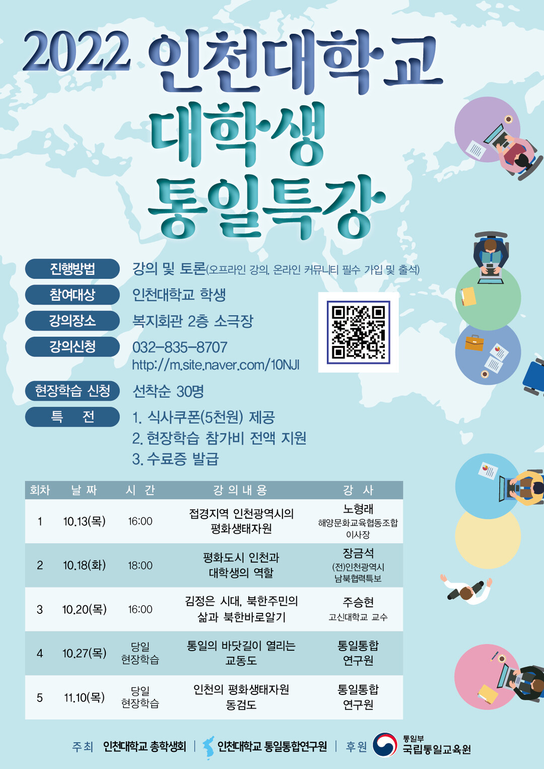통일특강은 남북 분쟁의 상징인 접경지역 인천광역시의 지정학적 특수성을 극복하고 평화도시와 남북교류협력의 교두보로서 인천지역 대학생의 평화와 통일을 위한 공감대 형성과 통일의식 저변 확대에 일조하고자 통일부 국립통일교육원의 후원으로 매년 열리고 있다.