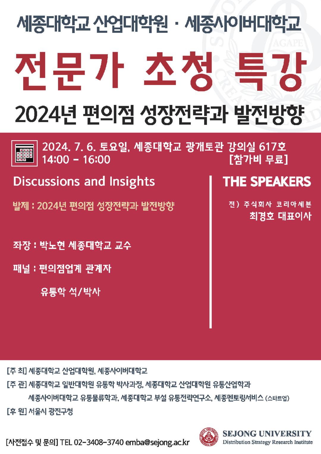 [대학저널 이선용 기자] 세종사이버대학교 유통물류학과, 세종대학교 산업대학원 유통산업학과가 오는 7월 6일 ‘2024년 편의점 성장전략과 발전방향’을 주제로 전문가 초청 특강을 공동주최한다.