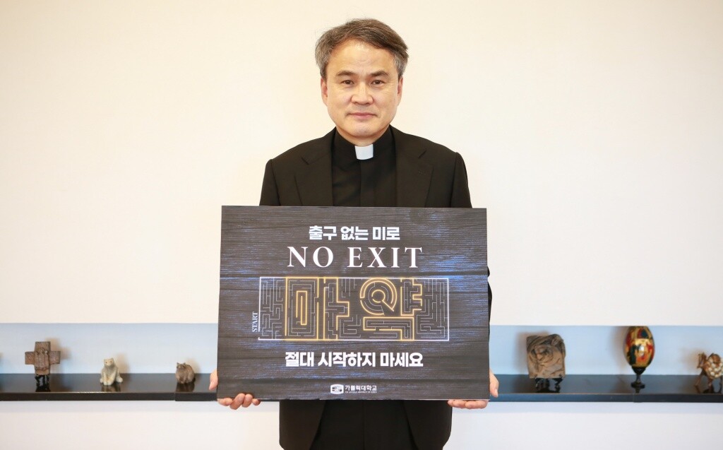 가톨릭대 원종철 총장이 마약 근절을 위한 릴레이 캠페인 ‘NO EXIT’에 동참했다. 사진=가톨릭대 제공 |