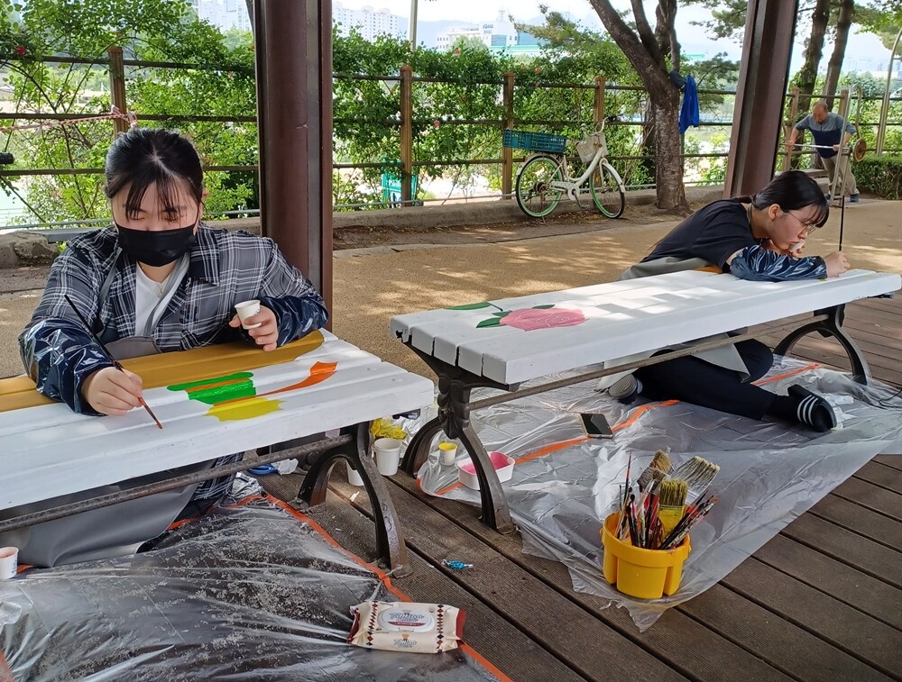 [대학저널 온종림 기자] 서일대학교 생활가구디자인학과가 지역사회 연계프로그램을 통해 서울시 중랑구청 공원녹지과와의 협업으로 서울장미축제가 열리는 수림대공원의 낙후된 벤치 16개 리폼을 진행했다.
