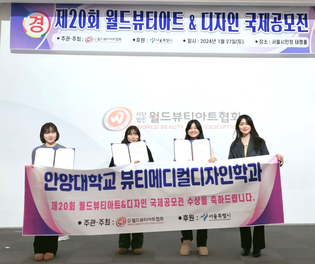 서울시 중구 서울시민청 태평홀에서 27일 열린 ‘제20회 월드뷰티아트&디자인 국제공모전 시상식’에서 김다혜 학생 등 안양대 뷰티메디컬디자인학과 14명은 대학부 부문에서 국회의원상과 금상, 은상, 동상 등을 받아 참가자 전원이 수상하는 쾌거를 올렸다.