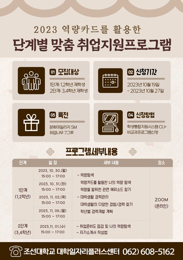 이계행 조선대 대학일자리플러스센터장은 “대학일자리플러스센터에서는 앞으로도 학년 특성에 맞는 단계별 맞춤 취업전략 수립을 위해 적극적인 지원을 아끼지 않겠다”고 밝혔다.