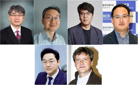윗줄 왼쪽부터 화학과 김종승 교수, 화학과 우한영 교수, 건축사회환경공학부 노준홍 교수, 전기전자공학부 안춘기 교수, 생명공학부 김종훈 교수, 인공지능학과 Klaus-Robert Müller 교수.