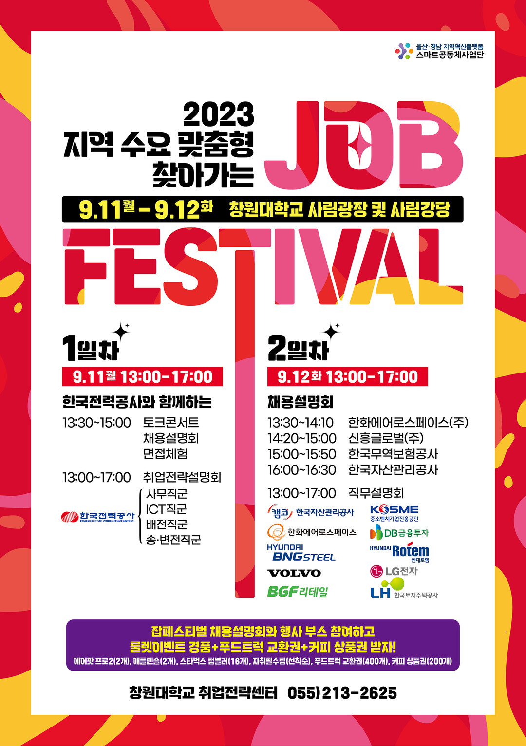 창원대 취업전략센터 주관으로 열리는 이번 잡 페스티벌에서는 ‘채용설명회’, ‘진로취업멘토링’ 등을 운영해 다양한 취업정보를 제공할 예정이다.