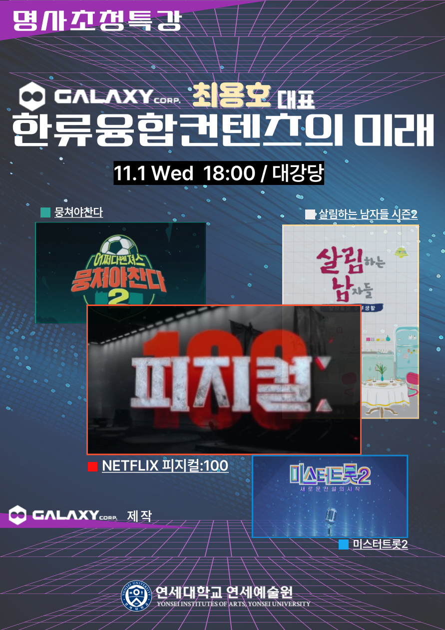 [대학저널 이선용 기자] 연세대학교 미래캠퍼스 연세예술원이 오는 11월 1일 오후 6시, 연세대 미래캠퍼스에서 AI 메타버스 기업 갤럭시코퍼레이션의 최용호 대표를 초청하여 특별 강연을 진행한다.