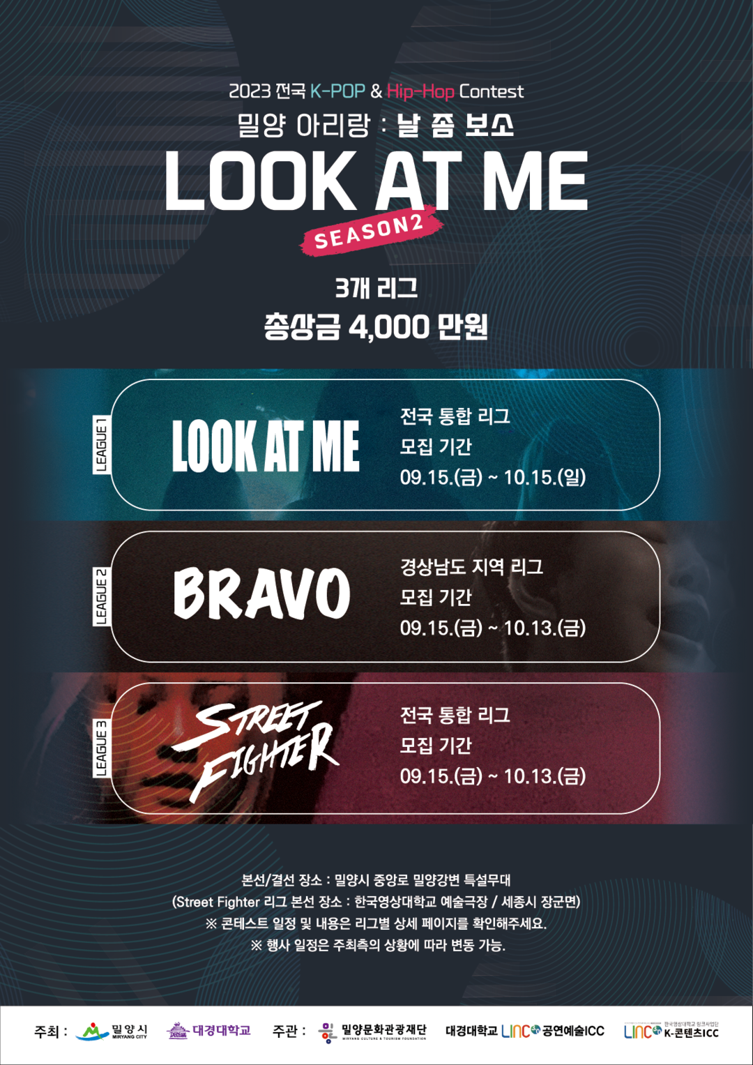 밀양시가 후원, 한국영상대가 주관하는 전국 K-POP&HIP-HOP 경연대회는 한류의 중심으로 떠오른 K-POP과 힙합 장르를 밀양아리랑과 접목시킨 예술 콘텐츠 문화경연대회다. 대회는 Look At Me리그, Bravo리그, Street Fighter리그 등 3개 리그로 나눠 예선(온라인)/본선/결선 순으로 진행된다.
