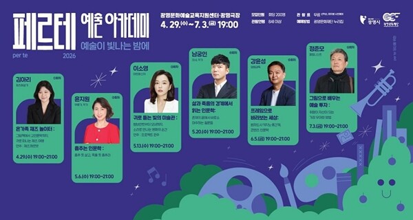[대학저널 임춘성 기자] 광명문화재단(대표이사 송은영)이 오는 4월 29일부터 7월 3일까지 광명문화예술교육지원센터 광명극장에서 예술 인문학 프로그램 ‘페르테 예술 아카데미 - 예술이 빛나는 밤에’를 개최한다고 밝혔다.