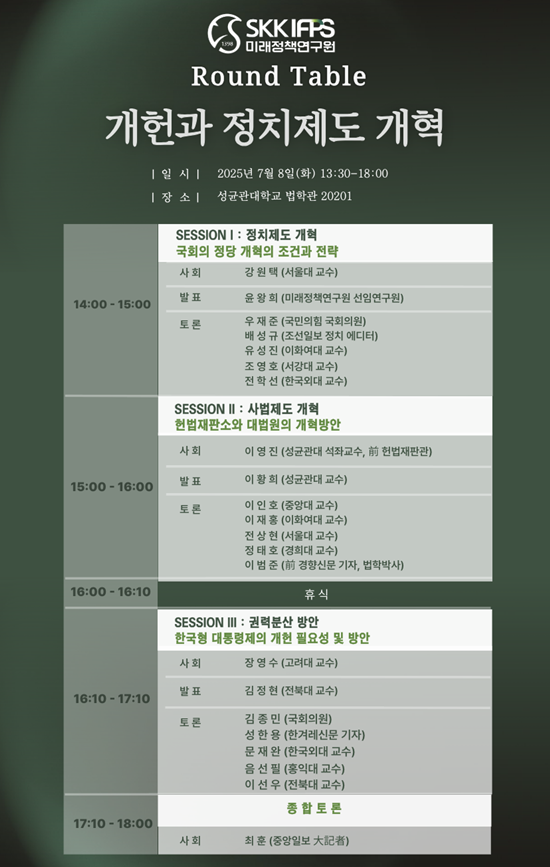 라운드테이블은 3개의 세션으로 구성되는데, 각각 ‘정치제도 개혁’, ‘사법제도 개혁’, ‘권력분산 방안’을 다루게 된다. 먼저 정치제도 개혁을 다루는 첫 번째 세션은 강원택 서울대 교수가 좌장을 맡고, 미래정책연구원의 윤왕희 선임연구원이 “국회와 정당 개혁의 조건과 전략”에 대해 발표한다. 이후 정치제도 개혁에 대해 우재준 국회의원, 배성규 조선일보 정치에디터, 유성진 이화여대 교수, 조영호 서강대 교수, 이선우 전북대 교수 등이 토론자로 나서 다양한 의견을 주고받을 예정이다.