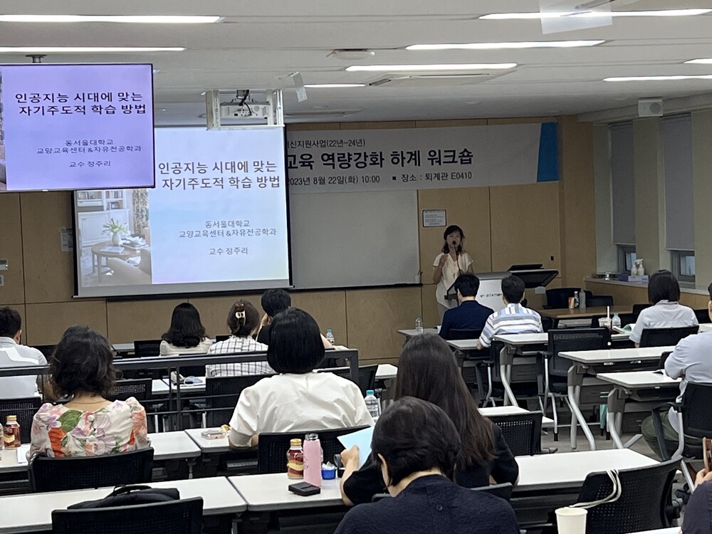 이날 워크숍에선 첫 순서로 동서울대 정주리 교수(전 교양교육센터장)가 인공지능 시대에 맞는 자기주도적 학습 방법과 교양 교육의 역할에 대한 특강을 했다.