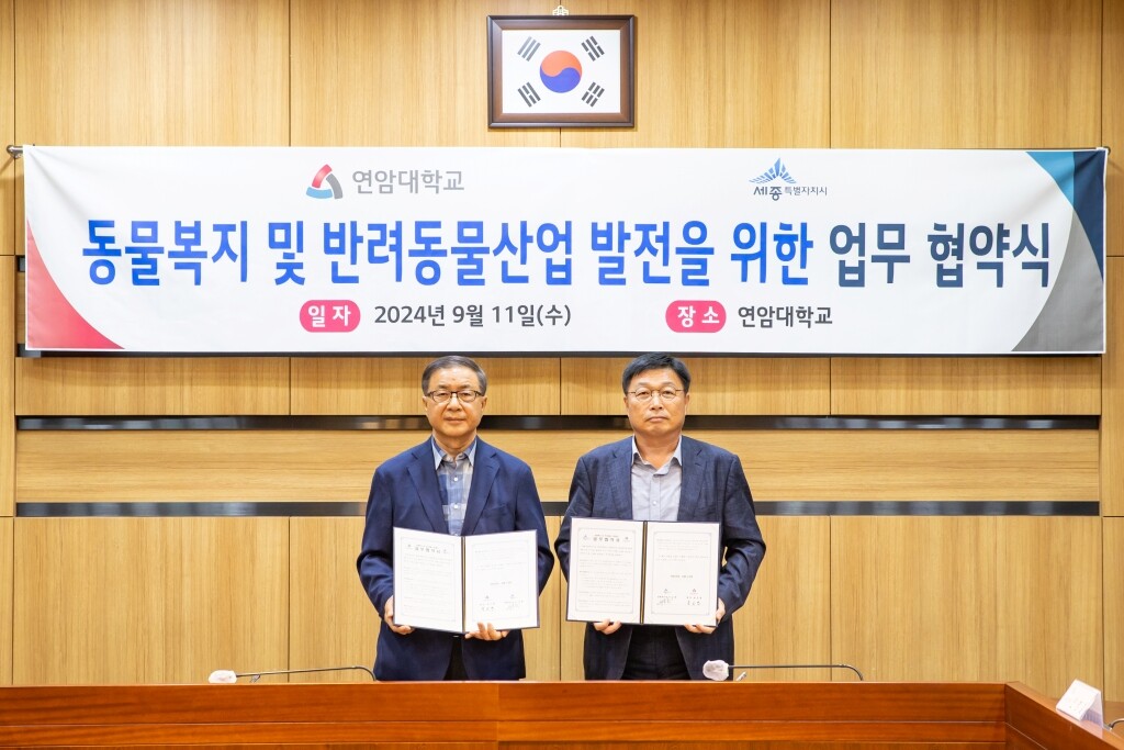 연암대가 11일 세종특별자치시와 ‘동물복지 및 반려동물 산업 발전’을 위한 업무 협약을 체결했다. 왼쪽이 연암대 육근열 총장, 오른쪽은 세종특별자치시 이승원 경제 부시장. 사진=연암대 제공 |