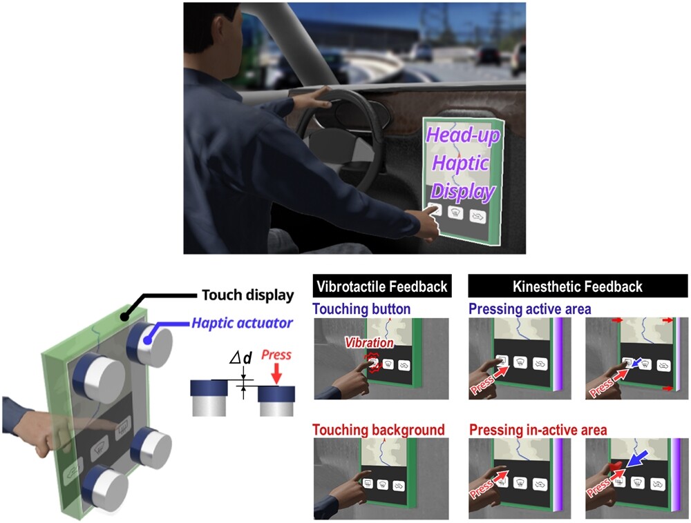 김상연 교수는 ““연구팀은 자동차 운전자가 시각의 도움 없이 진동 촉각 신호를 이용해 가상 버튼의 위치를 파악하고, 딱딱하고 무른 정도를 달리 조정하는 햅틱기능을 이용하여 버튼을 누를 수 있도록 도와주는 '헤드업 햅틱 디스플레이' 개념을 제시했다”고 밝혔다.
