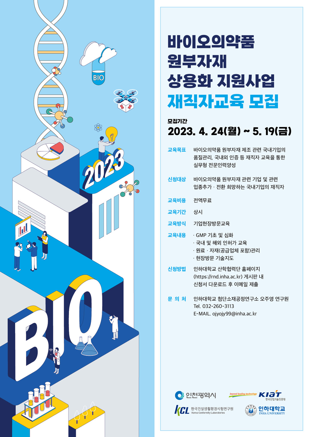 인하대 첨단소재공정연구소는 바이오의약품 원부자재 관련 산학협력 프로젝트 과제를 수행할 기업도 모집한다. 이 프로젝트는 산업현장에서 필요로 하는 연구과제와 애로기술을 대학과 기업이 공동 연구하는 내용이다. 약 6개월 동안 진행되며, 국비 지원을 통해 제품 상용화에 필요한 기술 구축에 기여할 예정이다.