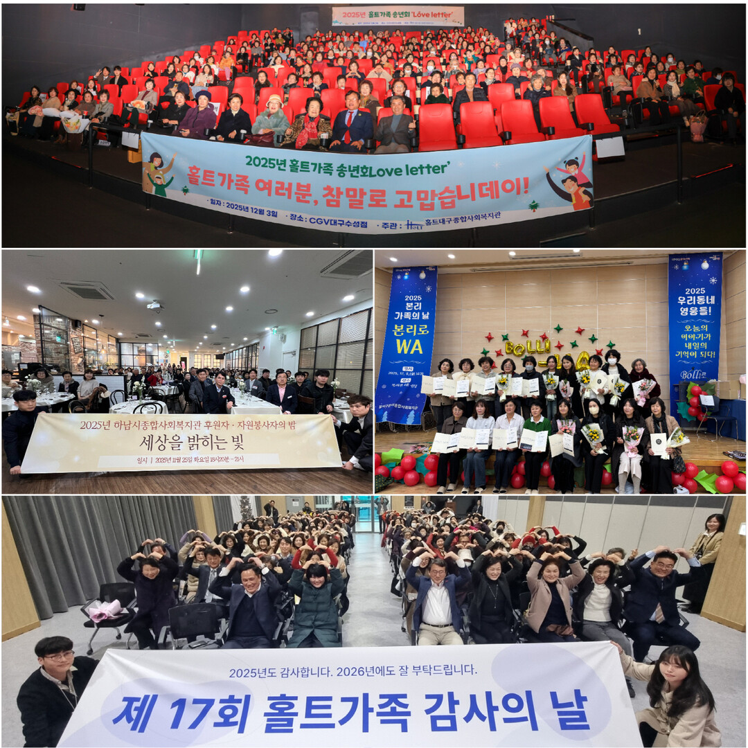 먼저, 지역사회 복지사업 수행 기관인 하남시종합사회복지관은 2025 후원자·자원봉사자의 밤 ‘세상을 밝히는 빛’(11월 25일)을, 홀트대구종합사회복지관은 ‘2025 홀트가족 송년회 Love Letter’(12월 3일)를, 홀트수영종합사회복지관은 ‘제17회 홀트가족 감사의 날’(12월 4일)을, 달서구본리종합사회복지관은 ‘2025년 본리가족의날 본리로 WA’(12월 8일)를 각각 개최했다.