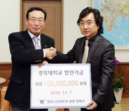 경북대(총장 함인석)는 민복기 올포스킨피부과 원장(사진 우측)이 모교인 경북대에 1억 원의 발전기금을 전달했다고 7일 밝혔다.