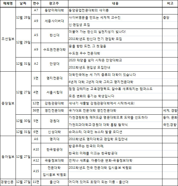 또한 지난 12월 27일부터 30일까지 코엑스에서 열린 2011학년도 전국 전문대학 입시홍보 박람회 광고가 동아일보에 게재돼 전문대학의 신입생 유치를 위한 적극적인 노력이 엿보였다.