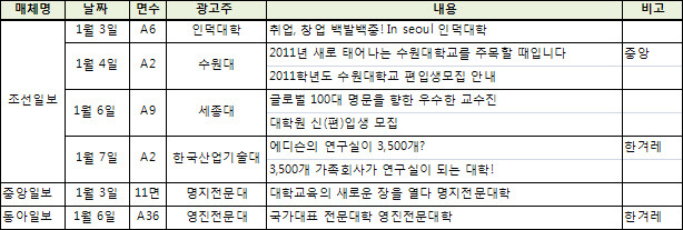 신묘년 새해가 시작된 1월 첫째 주는 대학 광고 건수가 현저히 줄어 대학 광고도 솜 고르기에 들어간 모양새다.