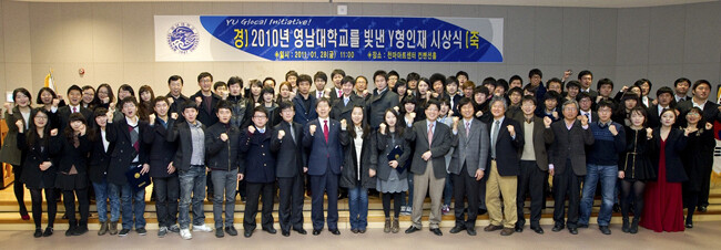 ▲ Y형 인재 시상식 = 영남대는 지난 1월 28일 'Y형 인재 시상식'을 열어 지난해 학교의 명예를 드높인 학생들을 격려하고 축하했다. 인성·창의성·진취성 부문에서 총 32개 팀이 선정됐으며, 수상 학생 중에는 생명공학부와 의학과, 언론정보학과 학부 재학생으로 각각 제1저자로 쓴 논문을 SCI급 국제저널에 게재해 학생들의 연구력도 세계적 수준임을 드러냈다.