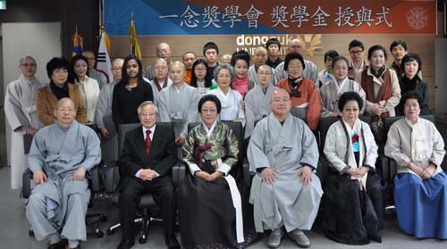 동국대학교 경주캠퍼스(총장 김영종)는 15일 교내 백주년기념관에서 일념장학회(이사장 이영채) 장학금 전달식을 가졌다.
