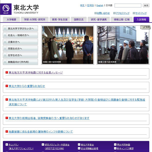 도호쿠대학은 이번 대지진과 쓰나미로 일부 건물이 붕괴되고 교육ㆍ연구 시설과 장비가 대부분 파손돼 4월 말까지 휴교에 들어갔다. 일부 대학 건물은 기둥까지 손상돼 철거를 해야 할 정도로 심각한 피해를 입었다.