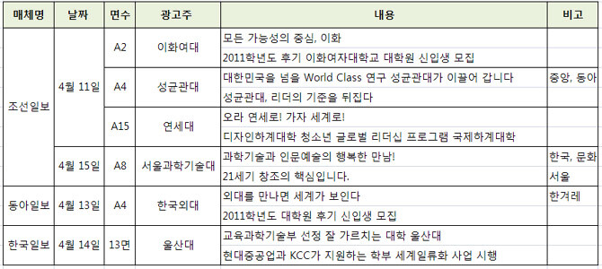 4월 3주 대학광고는 각 대학의 대학원 신입생 모집 광고가 주류를 이뤘다.