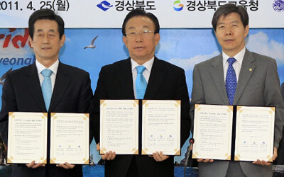 영남대(총장 이효수·사진 맨 오른쪽)는 25일 오전 경상북도청에서 경상북도(도지사 김관용)와 경북교육청(도교육감 이영우)이 참여하는 '지역 문화콘텐츠 기능성게임 개발사업을 위한 MOU'를 체결했다.