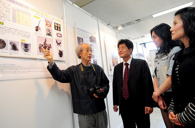 16일 오후 서울광진구 화양동 건국대 상허기념도서관 1층 로비에서 열리고있는 일제 약탈 문화재 반환 촉구 기획전인 '유랑하는 문화재-일본 고려박물관 10주년 기념 특별전'에서 야마다 사다오(왼쪽)이 관람객들에게 일제 약탈 문화재의 반환 필요성을 설명하고 있다.
