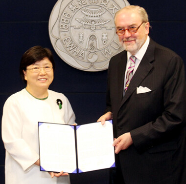이화여대는 30일 교내 본관 교무회의실에서 솔베이, 서울시와 ‘특수화학부문 글로벌 본부 R&D센터 건립’을 위한 협약을 체결했다. 협약식에는 김선욱 이화여대 총장, 크리스티앙 쥬르껭 솔베이 회장 등 양 기관의 주요 관계자들과 권영규 서울시 부시장 등이 참석했다.