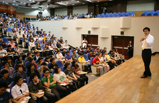 "등록금을 아예 없애자"는 파격 발언으로 주목을 받고 있는 정동영 민주당 최고위원이 31일 대학 강단에서 대학생들을 만났다.