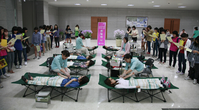 성신여대(총장 심화진)가 헌혈을 통해 사랑을 실천했다. 성신여대는 지난 5월 31일 대한적십자사 동부혈액원과 공동으로 제2캠퍼스인 운정그린캠퍼스(강북구 미아동 147번지) P동 1층 로비에서 '생명나눔 헌혈행사'를 개최했다. 이날 행사에는 학생 및 교직원 300여 명이 참석했다. 이해진(간호학과3) 씨는 "처음 해보는 헌혈이라 두려움도 있었다. 하지만 참여해 보니 작은 헌신으로 이웃사랑을 실천했다는 자부심으로 뿌듯함을 느꼈다"고 말했다. 사진은 헌혈나눔 행사에 참가하고 있는 학생들의 모습.