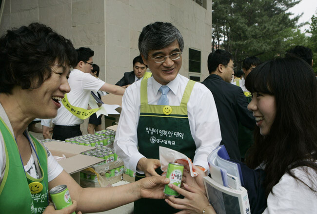 대구대(총장 홍덕률)가 기말고사를 치르는 학생들을 격려하기 위한 행사를 가졌다. 대구대는 지난 15일 중앙도서관 앞에서 아침을 거르고 등교하는 학생들을 위해 '차 한 잔의 여유' 행사를 갖고 찐빵과 만두를 제공했다. 이날 행사에서는 홍덕률 총장을 비롯해 대구대 학부모 10여 명이 참가했으며 손수 준비한 왕 찐빵과 왕 만두 1000여 개가 학생들에게 전달됐다. 또한 대구대 대구캠퍼스에 소재한 특수학교 5곳이 공동으로 설립한 학교기업, '성산'에서 장애학생들이 정성껏 만든 빵 300개도 함께 전달됐다. 학부모 김영숙 씨는 "시험 준비를 위해 끼니도 거르고 아침 일찍 도서관으로 향하는 아들을 보면 항상 안쓰러웠다"면서 "아들 같은 학생들에게 직접 간식도 나눠주고 격려도 할 수 있어 너무 즐거운 시간이었다"고 말했다. 한편 이 행사는 오는 17일까지 진행된다. 사진은 홍덕률 총장(가운데)이 한 학부모와 함께 학생에게 간식을 나눠주는 모습.