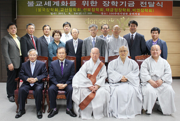 부산 영주암 회주 정관 스님과 부산 지역 불자들이 24일 불교 세계화 장학기금 3억 원을 동국대 경주캠퍼스(총장 김영종)에 쾌척했다.