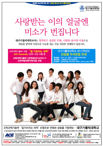 대구가톨릭대(총장 소병욱)는‘학생이 사랑받는 대학’을 지향하고 있다. 학생을 존중하고 사랑하는 학생중심의 대학문화를 바탕으로 우수한 교육프로그램을 운영하고 선진 교육환경을 구축하고 있다. 특히 3G(Global&Multicultural, Green, Grand) 캠퍼스 조성으로 학생들은 쾌적하고 선진화된 교육환경에서 공부하며 글로벌 시대의 주인공을 꿈꾸고 있다.