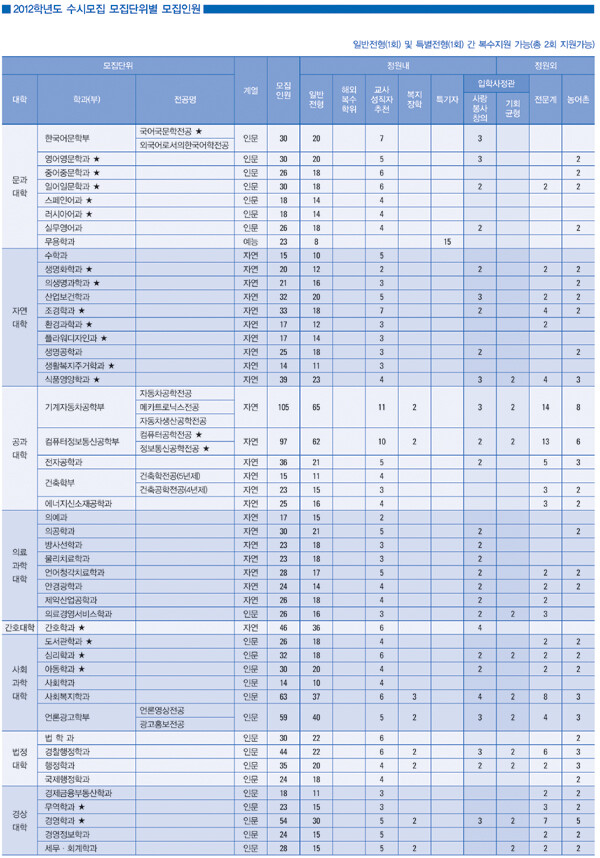 일반전형 1,336명 외에 해외복수학위 18명, 교사·성직자 추천 257명, 복지장학 25명, 특기자 17명, 사랑·봉사·창의 82명, 기회균형 30명, 전문계 125명, 농어촌 95명 등 8가지 특별전형을 통해 649명을 뽑는다. 사랑·봉사·창의 특별전형과 기회균형 특별전형은 입학사정관전형으로 선발한다.