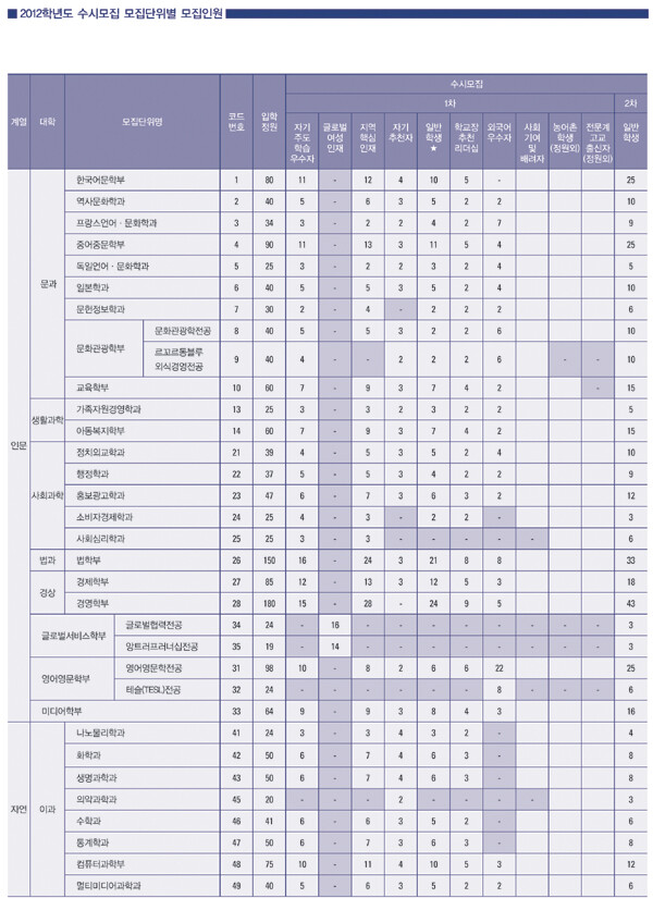 자기주도학습우수자전형은 학교생활에 적극적으로 참여하면서 미래의 꿈을 위한 학습을 계획하고 점검하며, 학습목표를 달성하는 학생들을 선발하기 위한 전형이다. 글로벌여성인재전형은 글로벌서비스학부 학생을 선발하기 위한 전형이며 지역의 여성인재 육성을 위해 2010학년도에 신설된 ‘지역핵심인재’ 전형은 올해에도 변함없이 실시된다. 지난해 자기추천자-인문역량 부문과 자기추천자-수학과학역량 부문으로 분리돼 있던 전형은 하나의 전형으로 통합, 인문계열 50명·자연계열 30명으로 전체 모집단위에서 80명 선발한다. 인문계열은 ‘인문적 소양이 우수한 자’, 자연계열은‘수학·과학 관련 분야에 관심과 열정이 있는 자’를 선발한다.