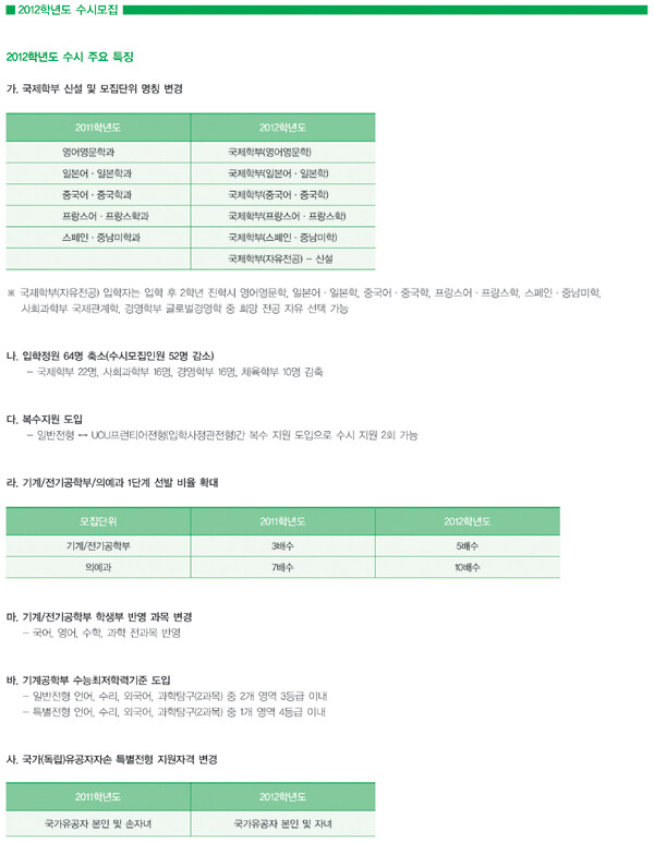 입학사정관전형에서는‘학교장추천전형’이‘UOU프런티어 특별전형’으로 명칭을 변경해 50명을 선발하고 기초생활수급자및차상위계층 특별전형은 45명을 모집, 전년도에 비해 46명을 더 모집한다. 1단계에서 학생부 100%로 3배수를 선발하며 2단계에서 학생부 40%, 서류 20% 및 심층면접 40%로 최종 신입생을 선발한다. 1단계를 합격한 경우에 필요서류를 제출하면 된다.