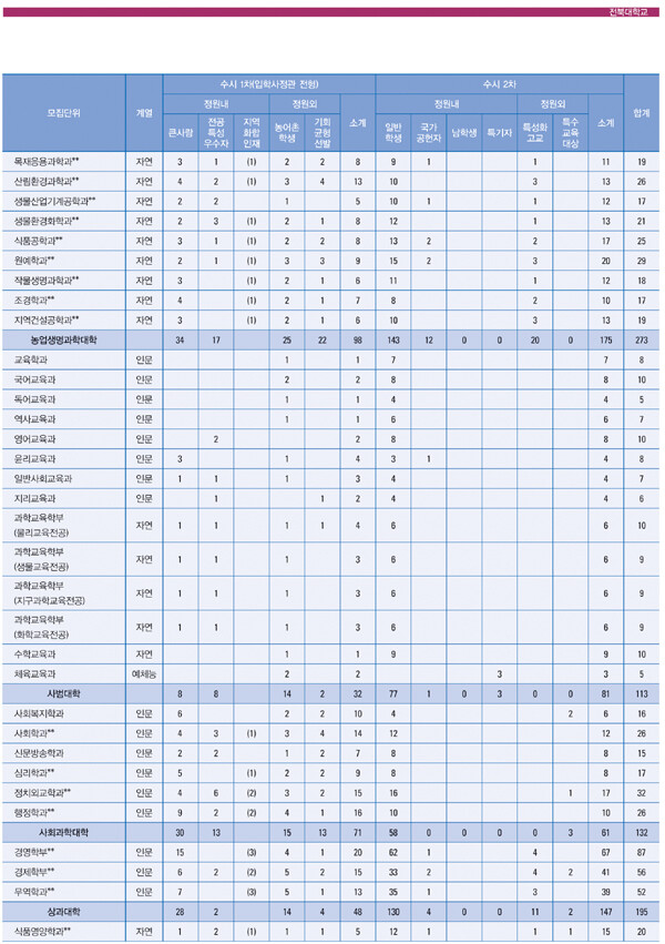 전형 일정은 수시 1차 모집의 입학원서 접수가 8월 11일(목)부터 17일(수)까지이고, 수시 2차는 9월 19(월)부터 22일(목)까지로, 입학정보 홈페이지(http://enter.jbnu.ac.kr), (주)유웨이어플라이(http://www.uwayapply.com) 등에서 접수하면 된다.