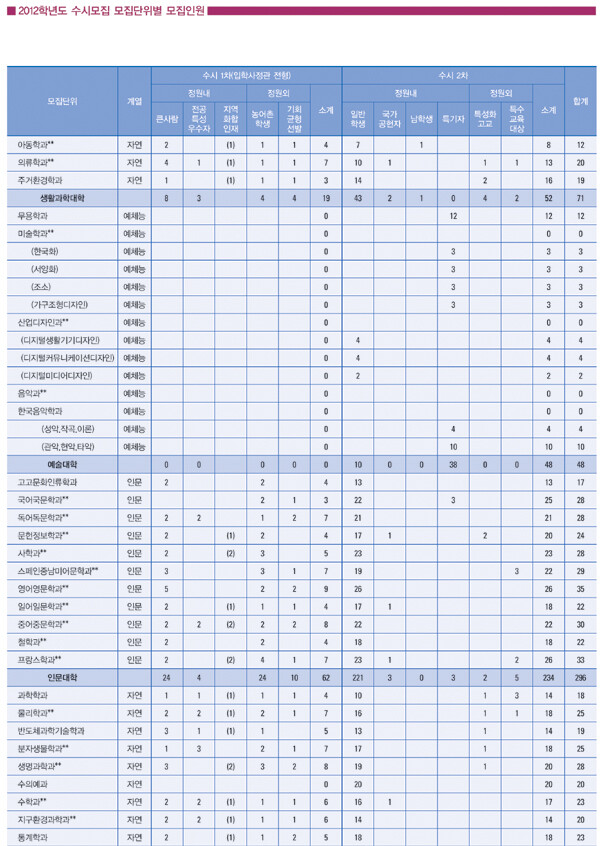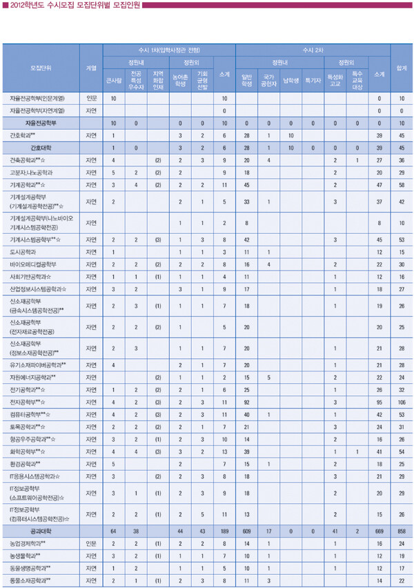 먼저 입학사정관제 전형만으로 선발하는 수시 1차에서는‘큰사람전형’248명,‘전공특성우수자전형’ 104명, ‘지역화합인재’20명,‘농어촌학생’164명,‘기회균형선발’119명 등 지난해 619명보다 다소 선발 숫자가 늘었다. 또한 수시 2차에서는 일반학생 1569명을 비롯해 국가공헌자 47명, 남학생전형 11명, 특기자 전형 47명, 특성화고교전형 88명, 특수교육대상자 20명 등을 선발한다.전형방법은 수시 1차는 1단계에서 학생부 교과성적 600점, 학생부 비교과영역 400점으로 선발하고 최종으로 학생부 및 서류 종합평가 500점, 심층면접 500점을 적용해 선발한다. 수능성적 반영은 2개 영역 평균등급이 지정등급 이내여야 한다. 또한 수시 2차는 1단계에서 학생부 800점으로 최종에서 학생부 800점, 면접 200점으로 선발하고 수능성적 반영은 수능 4개(예술대는 3개) 영역 중 2개 영역이 각각 지정등급 이내면 된다.