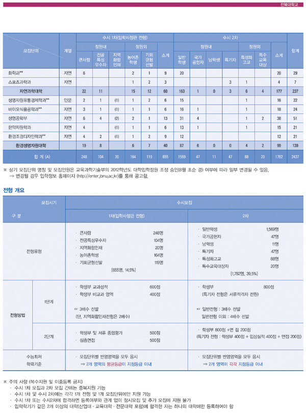 전북대의 2012학년도 입학사정관전형은 전형 유형 간소화에 이어 모집 시기를 수시 1차로 집약시키고 선발인원을 확대했다는 점이 특징이다. 또한 큰사람전형과 글로벌리더전형이 통합돼 큰사람전형으로 실시되고 지방자치단체장추천전형은 지역화합인재전형으로 변경됐다.