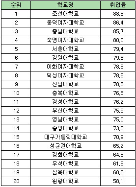 동덕여대가 86,4%로 뒤를 이었으며 충남대 85.7%, 숙명여대 80%, 서울대 79.4% 순으로 나타났다. 약학대학 전체 취업률은 74.1%를 기록했다.